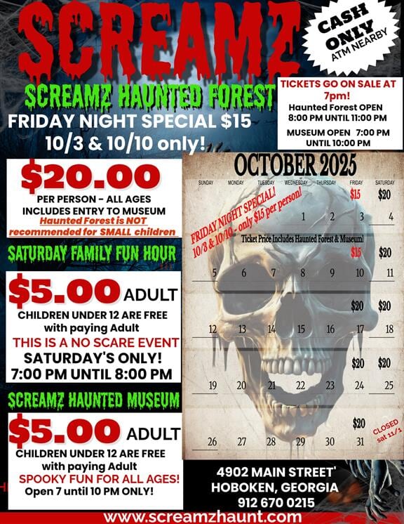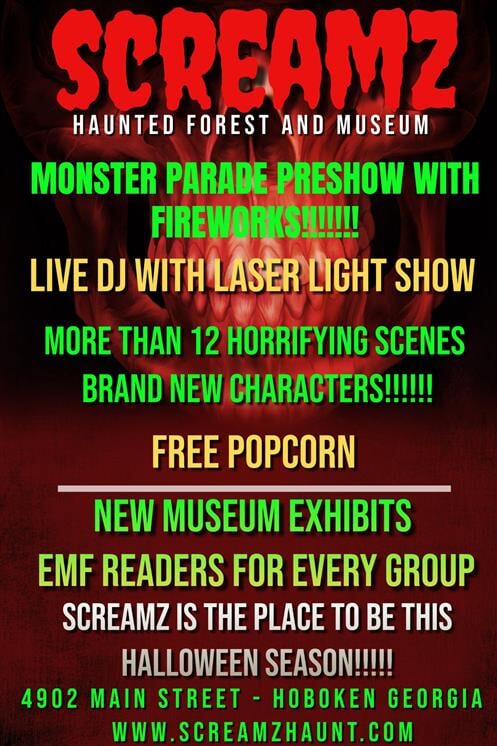 SCREAMZ Haunted Experience is located on what was once a working family farm in the heart of Hoboken, Georgia. In 2018 it was turned into SCREAMZ Haunted Experience which now includes a Haunted Museum, Haunted Forest and Haunted Field. All three attractions are included in the cost of your ticket.